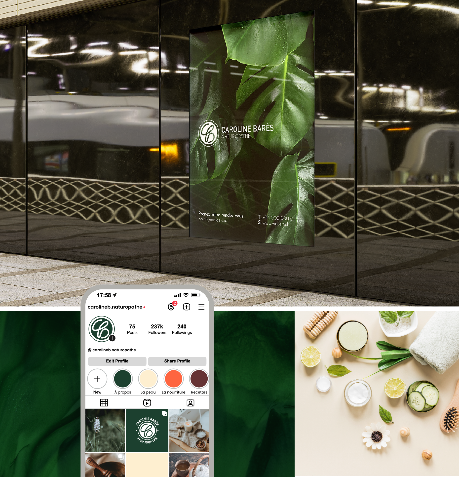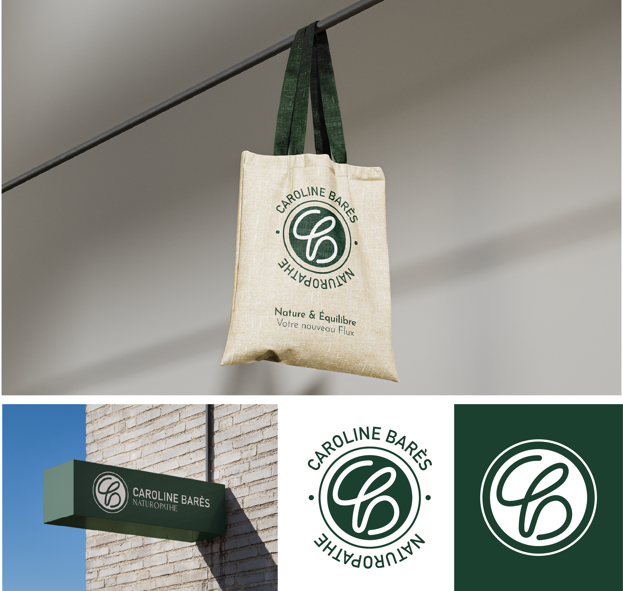 Caroline is a naturopath based in southern France. The goal of this project is to build a modern, professional but also feminine look for her brand.